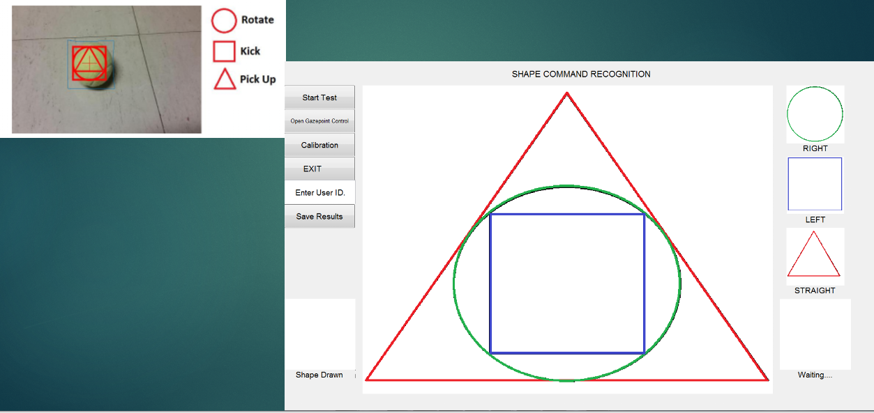 In the first phase, I developed a 'Gaze-Command' language. Using a 60Hz tracker, I built a MATLAB-based processing pipeline that filtered involuntary saccades and utilized Hough Transforms to identify geometric shape gestures. To bridge the gap between human intent and robotic latency, I implemented a stochastic ARMA(2,1) forecasting model to predict gaze paths in real time. This allowed for seamless control of both humanoid (NAO) and mobile robotic platforms.